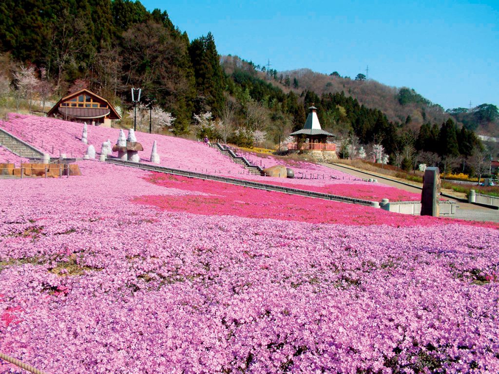 小原温泉郷からほど近いレクリエーション施設にある『スパッシュランドパーク』は、四季折々の花が楽しめるスポット。特に4月下旬から5月上旬に見頃を迎えるシバザクラは、2万株の数を誇り、県内屈指の壮大な眺め