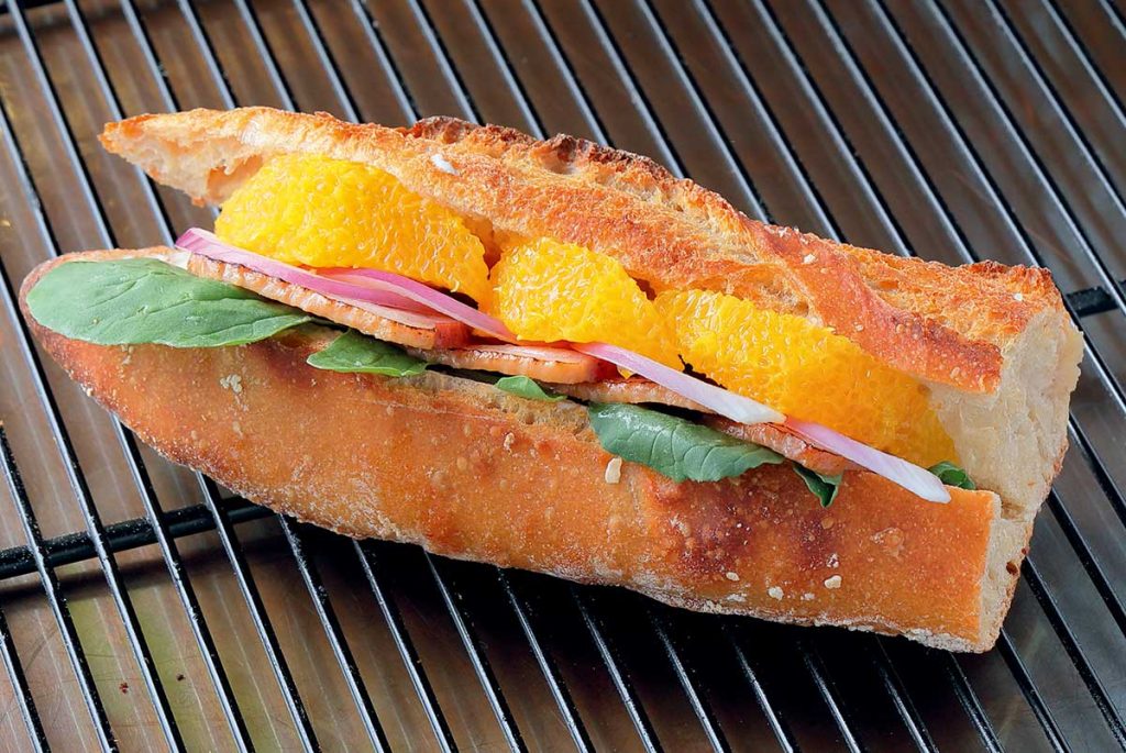「炙り鴨とオレンジの自家製ワインソースのバゲットサンド」(450円)