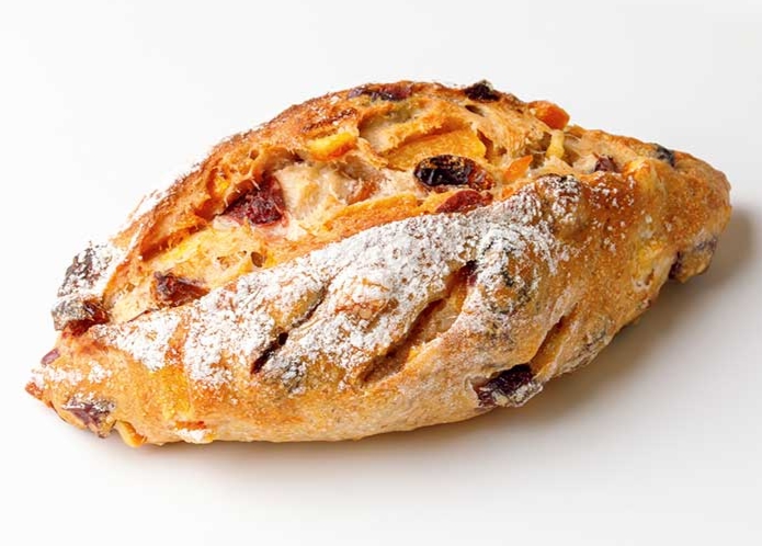 オーバーナイト発酵させた生地に、ドライフルーツやオレンジピールがたっぷり入った「フルーツカンパーニュ」(280円)
