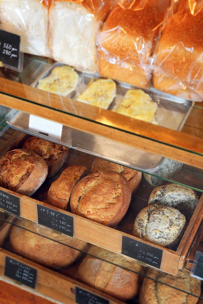 この店で焼き上げるのは、粉と水、塩、酵母のみで作るフランス仕込みのリーンなパン。特に小麦粉は、その保水率やグルテンの強さによって繊細に使い分けています。発酵時間をぜいたくにとっているので、どれもずしりとした仕上がり。重みはありつつも皮はあくまで香ばしく、生地はもっちり。ひと口かみしめれば小麦の甘さがふわりと広がりますよ。人気の食パンは1日6回ほど焼いていますが、焼き上がりの最終は14時頃なので早めの来店がおすすめです。