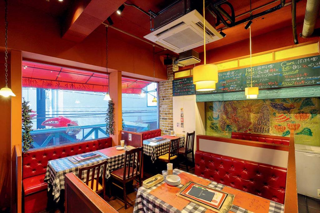 お店はビルの地下にあります。赤いギンガムチェックのテーブルクロスがキュート