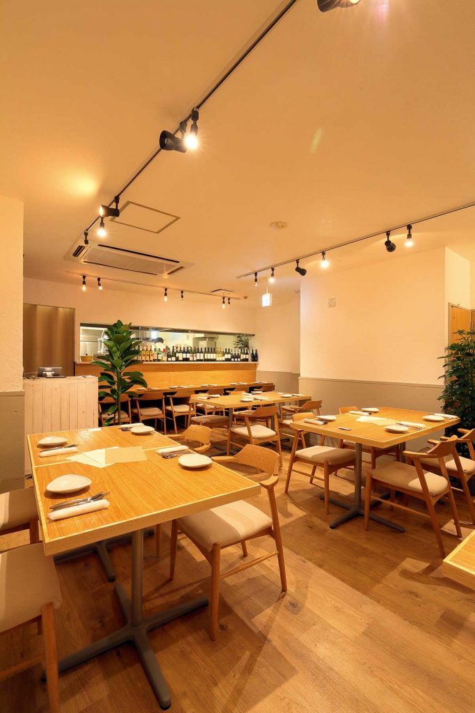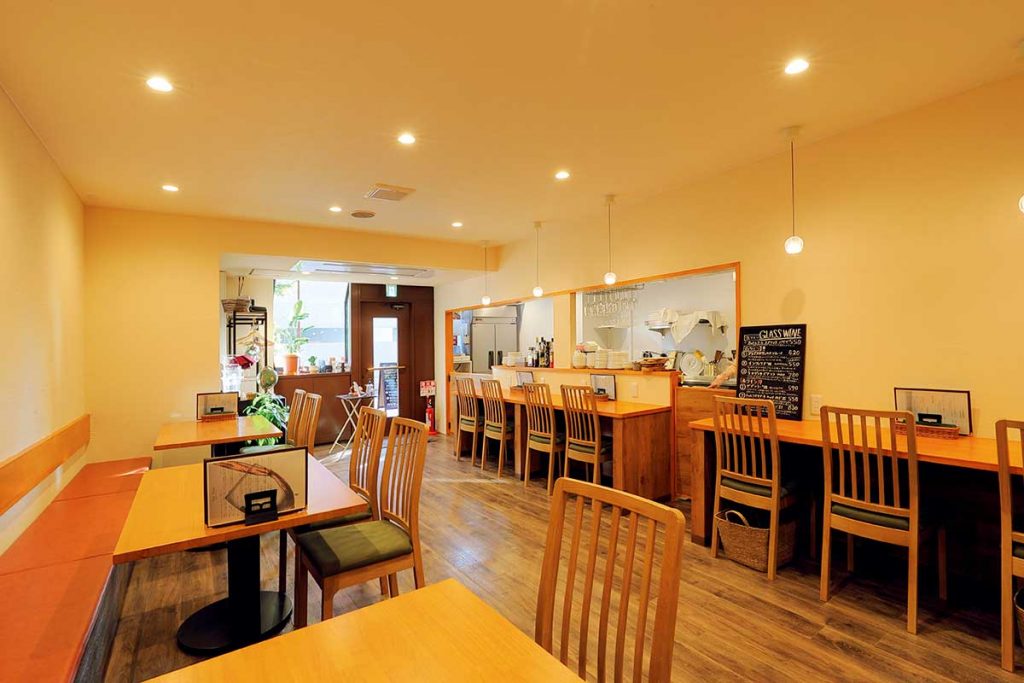 板張りの床に籐のイスが並ぶ店内。温かみのある照明が、心地よい空間を形作っています