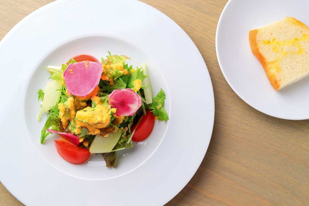 フレッシュな「ガーデンサラダ」に自家製フォカッチャを添えて。人参ドレッシングの彩りが可愛らしいお花のようです