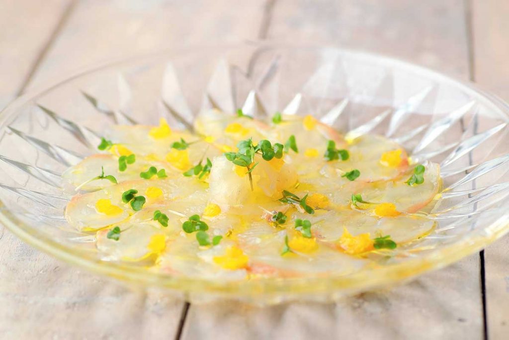 旬魚を美しいひと皿に仕立てた「鮮魚のカルパッチョ」。この日は宮城県産のヒラメが登場