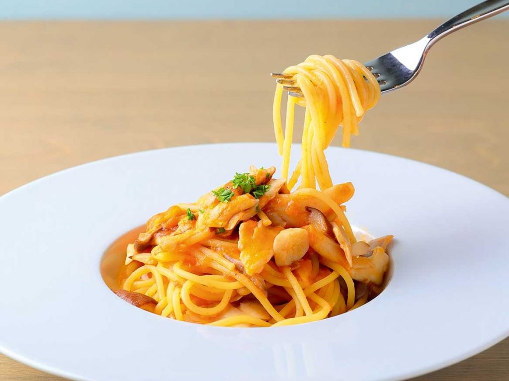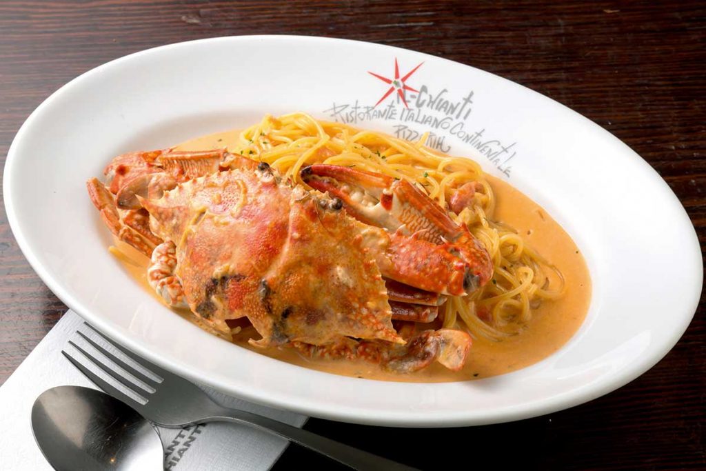 「渡り蟹のトマトクリームスパゲティ」。アルデンテに茹で上げた細めの特注パスタが、濃厚ソースによく絡みます