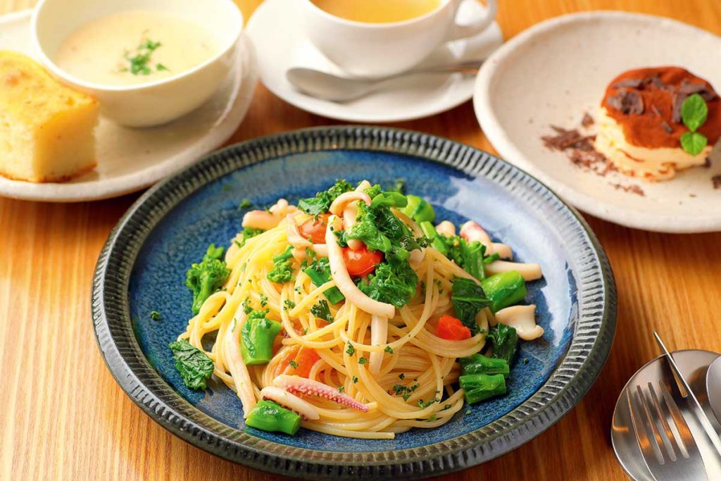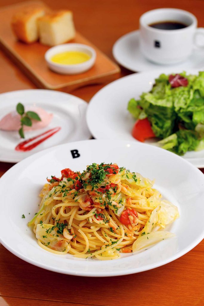 「桜エビと春キャベツ、ドライトマトをあしらえたスパゲッティ」。セットにはサラダ、フォカッチャ、デザート、ドリンクが付きます