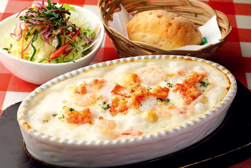 お手製ホワイトソースのシーフードグラタン。定番人気のひと品