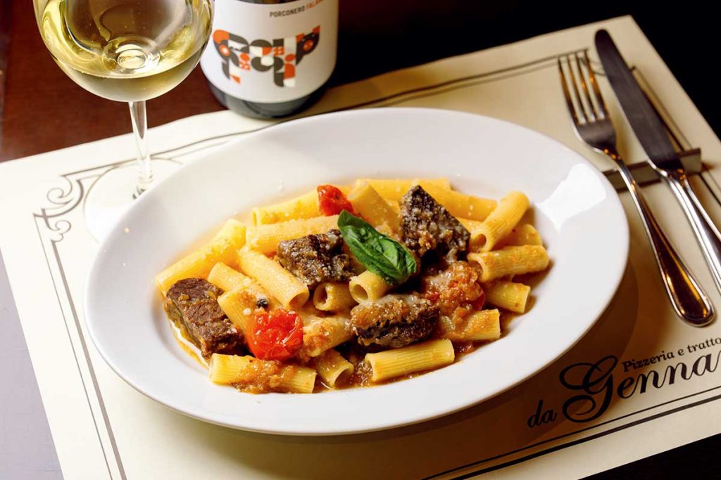 「牛ホホ肉玉ねぎ煮込みソース リガトーニ」。タマネギの水分だけで4~5時間煮込んだ牛ホホ肉はトロトロです