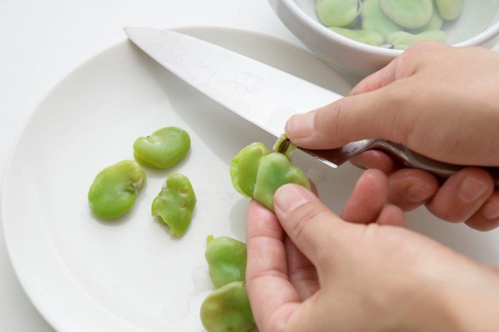 1■ソラマメはさやから実を外し、塩茹でして水に取って薄皮をむく。
