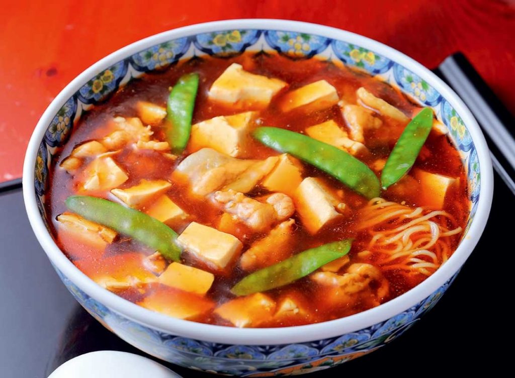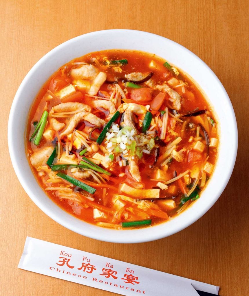 『仙台ホテル』の中華レストラン出身の料理長が腕を振るう『孔府家宴 泉中央店』。こちらの酸辣湯麺は、なんとフレッシュトマト入り!鶏ガラベースのスープに四川豆板醤の辛み、黒酢のコクと酸味、フレッシュトマトの旨みと酸味が加わってなんとも深い味わいに。仕上げに自家製のラー油をひと回しして、ピリリとした刺激をプラス。麺はちぢれ細麺を採用しており、繊細な舌触りが楽しめますよ。すっきりと上品な後味の一杯は、女性ファンが多いのもうなづけます。