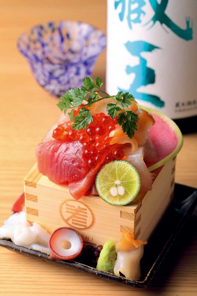看板メニューの「おはしの枡盛り」(1,058円)。マグロやキチジなど、その日に仕入れた新鮮な魚介を6~8種類も味わえます