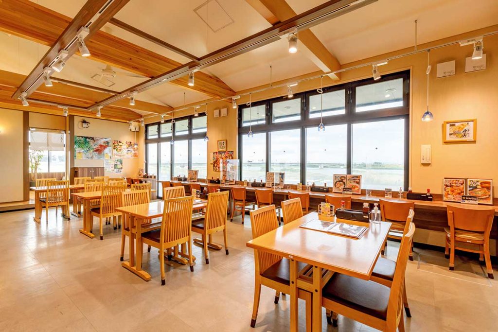 ガラス張りの広い窓から、大空と名取川が一望できます。特に、夕暮れ時の美しさは息を飲むほどです