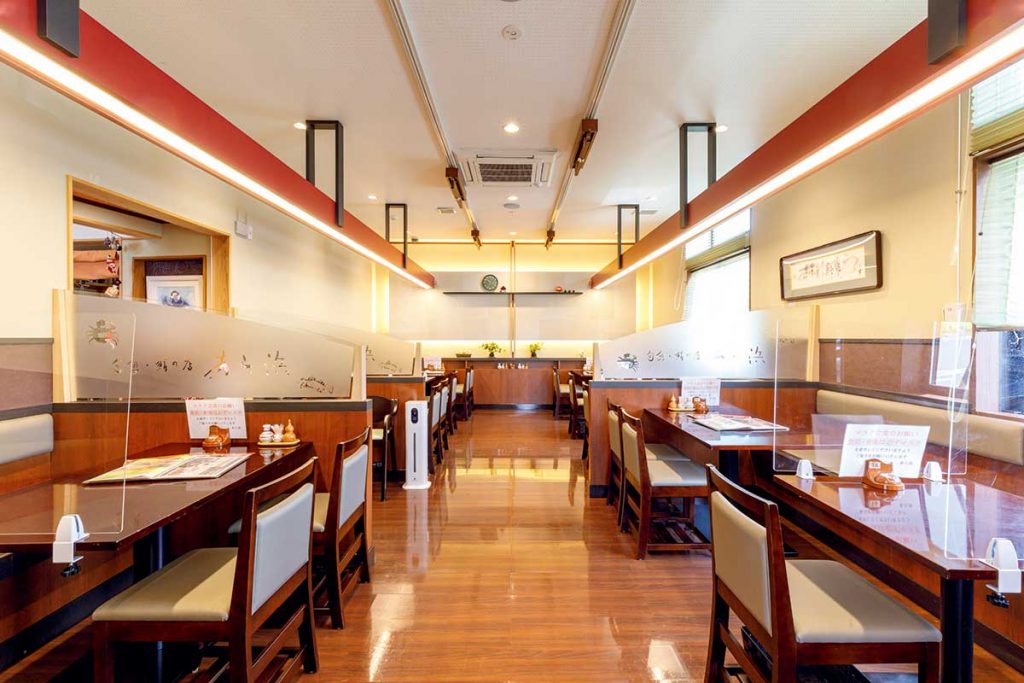 感染症対策のため、1組1卓の案内を徹底。エアカーテンも6台導入しています