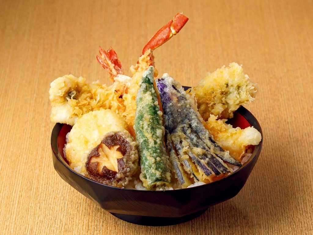 エビ、ズワイガニ、アナゴ、ホタテ貝、野菜3種の天ぷらを盛り込んだ「極み天丼」(2,200円)。甘じょっぱいタレがご飯とよく合いますよ