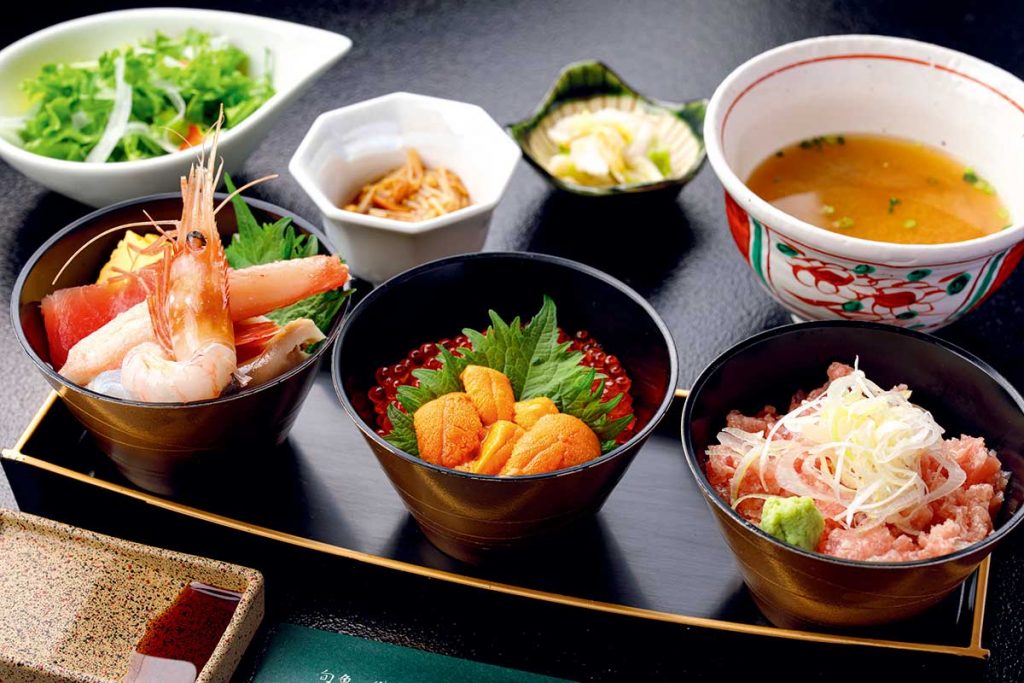 海鮮丼、ウニいくら丼、ねぎとろ丼と、3種の豪華なミニ丼を一度に味わえる「特選海鮮三種」(2,365円)※限定30食