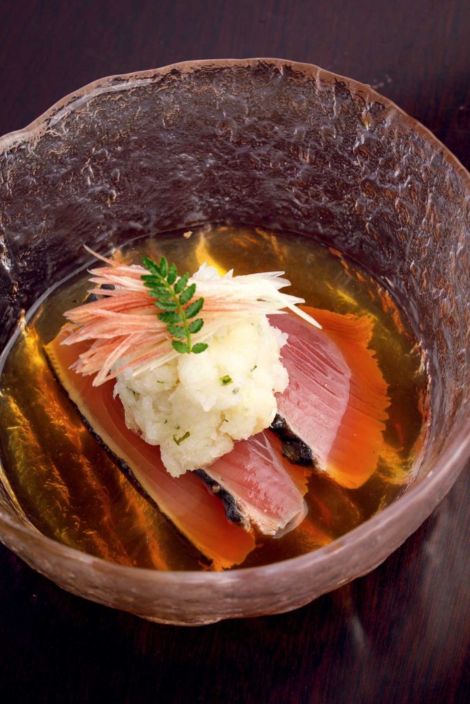 脂ののったカツオと自家製ポン酢を合わせた「かつをの酢のもの」(一人前980円、ハーフ680円)※写真はハーフ。4~11月限定
