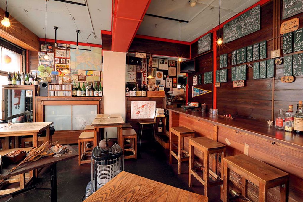 レトロな雰囲気の店内。壁には今日のおすすめや定番メニューを書いた黒板がかかっています