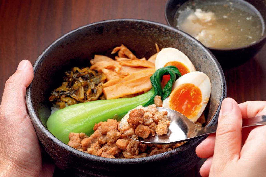 「特製魯肉飯」(880円、テイクアウトは864円)。「排骨スープ」(220円、テイクアウトは216円)はご飯とセット注文で50円引き