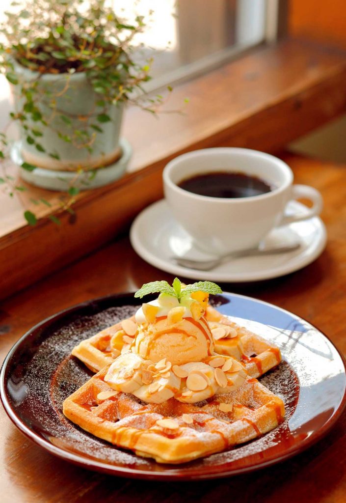 人気の「キャラメルバナナ&ワッフル」(ドリンク付・1,280円)。あつあつのワッフルに冷たいアイスがベストマッチ