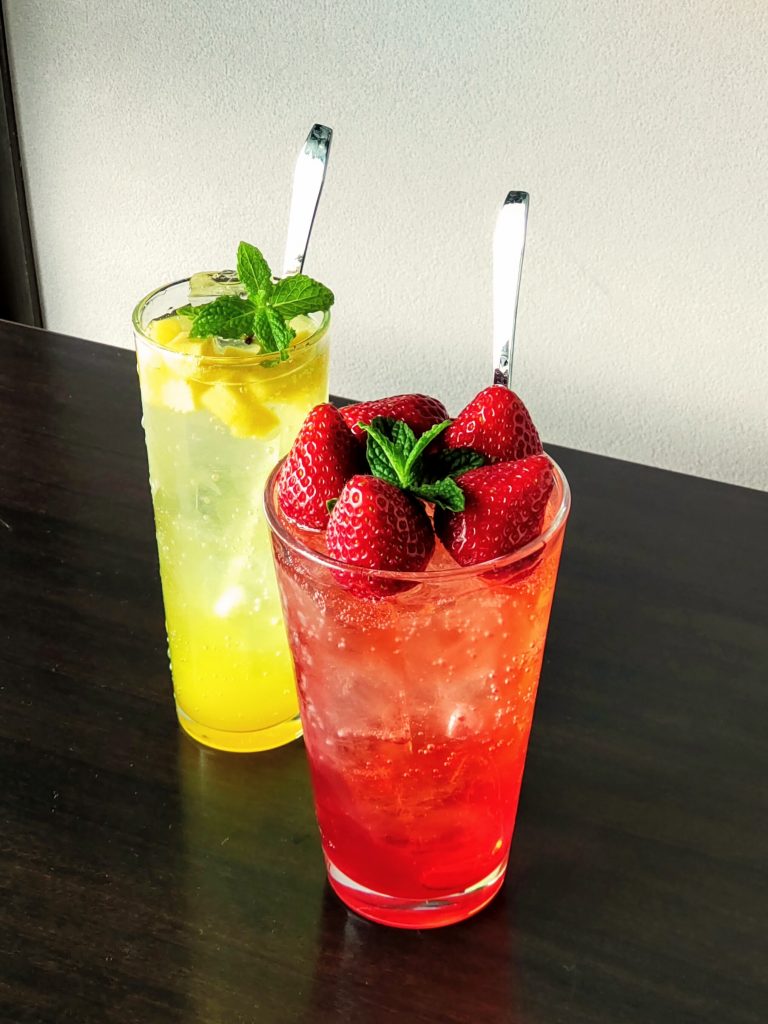 「いちご丸ごとフレッシュフルーツサワー」(770円)や「マンゴーソースのスカッシュ」(500円)は見た目も涼しげ!