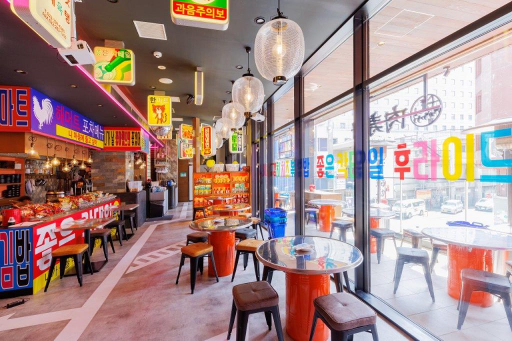 賑やかな韓国の屋台をイメージした店内。夜になるとネオンが灯り、より異国情緒豊かに