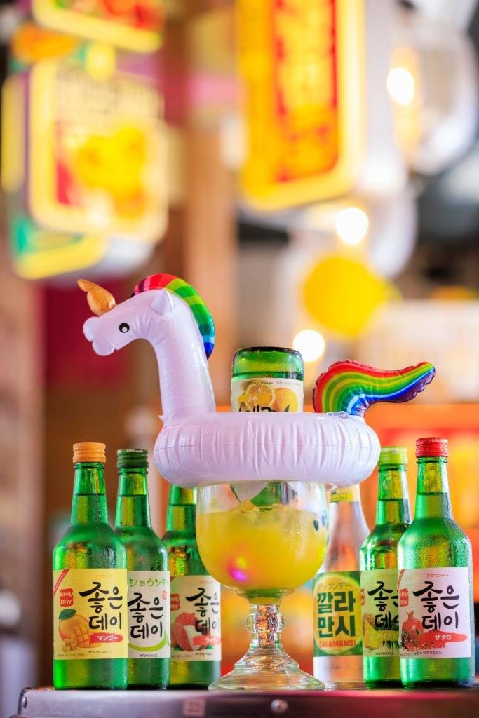 「ジョウンデー」という韓国焼酎をソフトドリンクで割った、見た目もインパクト大の「ジョウンテル」(1,490円)も必見