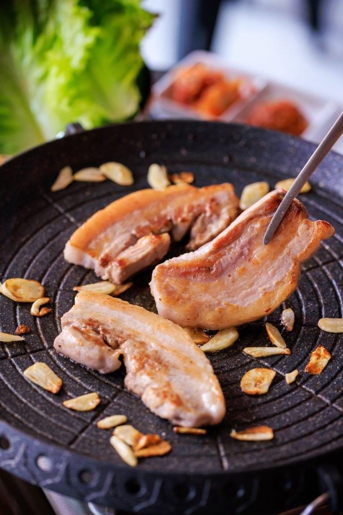 ぶ厚い豚バラ肉を好みのサイズのカットして楽しむ「サムギョプサル」(セルフ1人前1209円)。ゴマ油を付けて食べるのが本場流