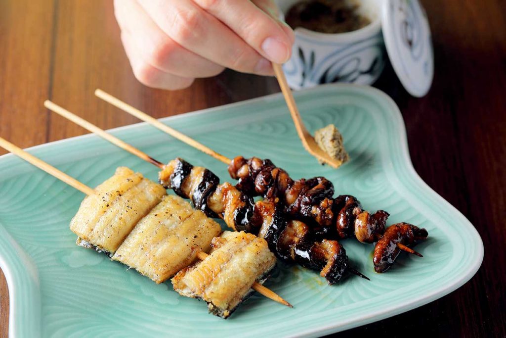 「鰻串焼き(3種盛り)」(2,068円)。右から肝、うなぎの切れ端を巻き付けた「くりから焼き」、短冊焼