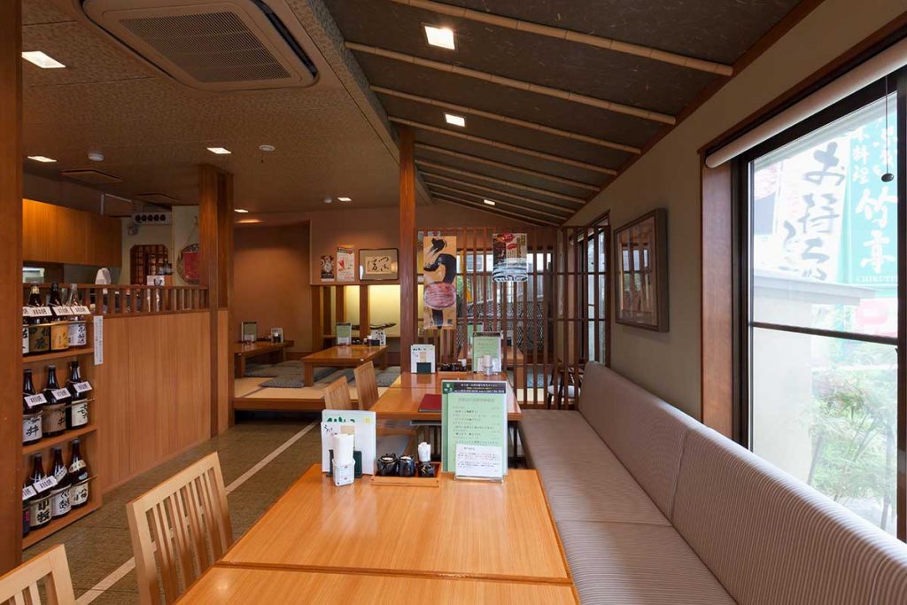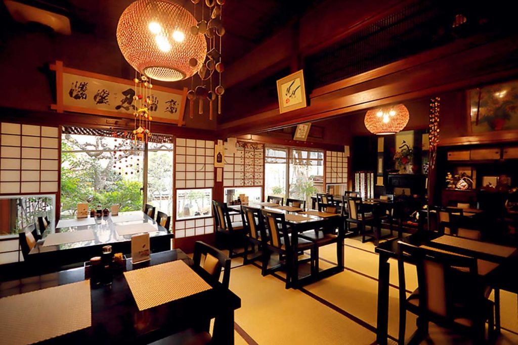 中庭を望む畳敷きにテーブル席の店内。昭和初期に建てられた旧家をそのまま使用しており、趣があります