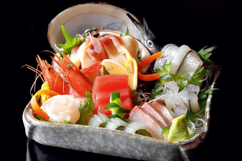 「会席膳」(要予約)の際に並ぶ、彩り豊かな旬魚のお造り(写真は2人前)