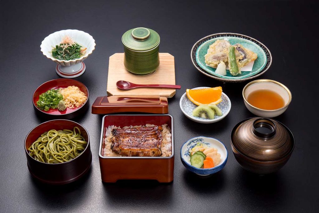 おすすめの新メニュー「ミニ鰻重と茶そばのセット」(4,000円)。うなぎはもちろん、茶そばに天ぷらなどが付いた大満足の内容です