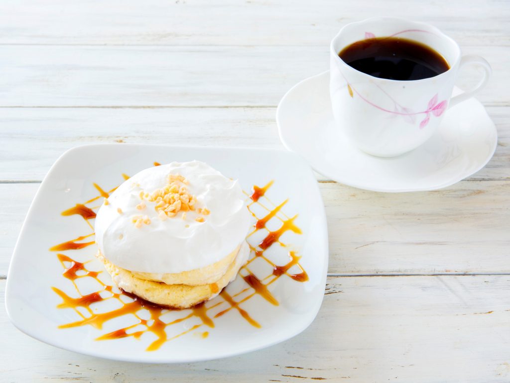 クリームパンケーキのハーフがセットに!写真の「ハーフサイズクリームパンケーキセット」は、あらゆる単品食事メニューに+900円でつけることもできます