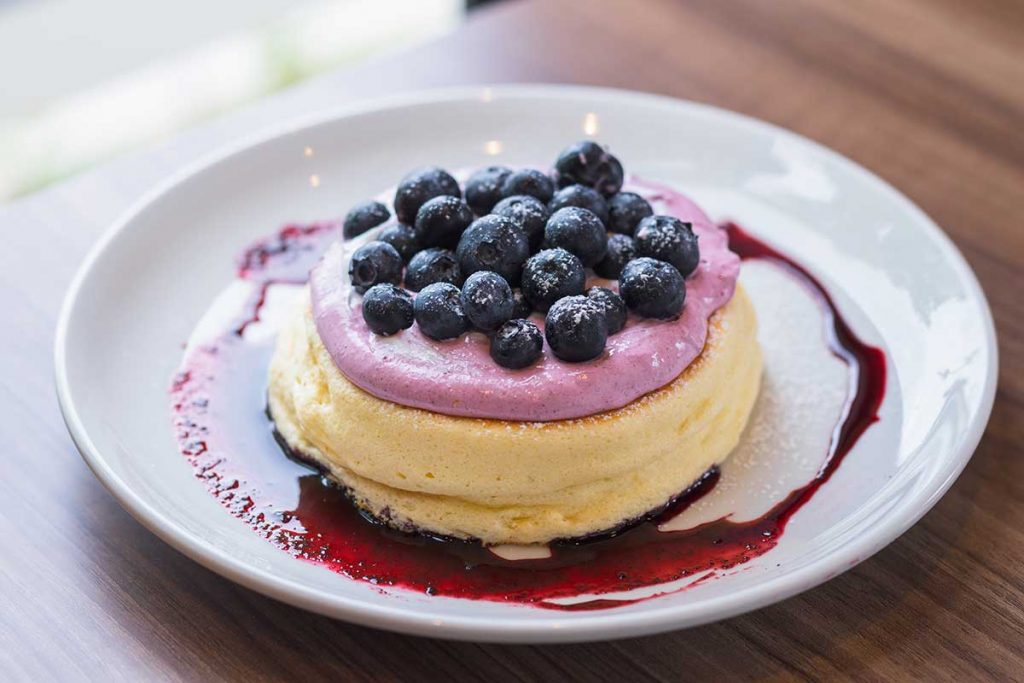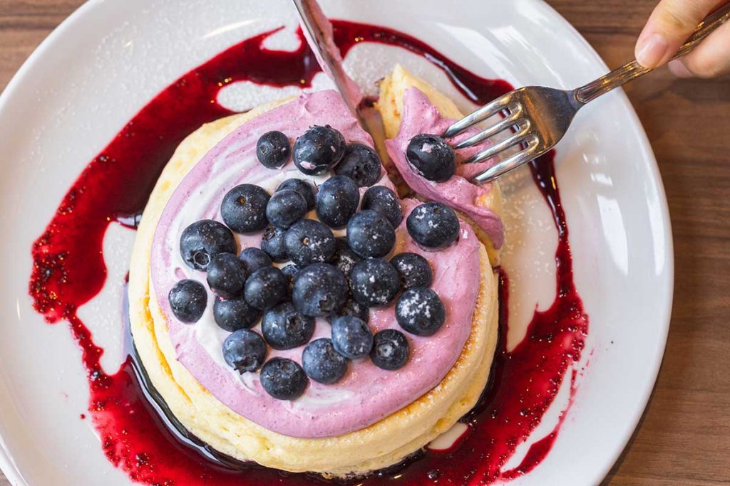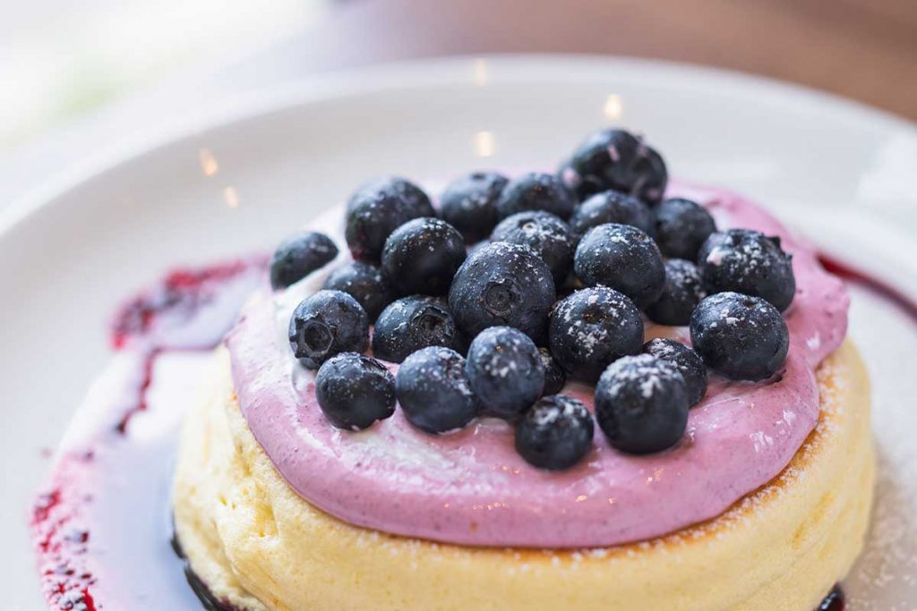 こちらは、ふわふわのパンケーキにブルーベリークリームとフレッシュブルーベリー、甘酸っぱいソースを合わせたブルーベリー尽くしのパンケーキ。