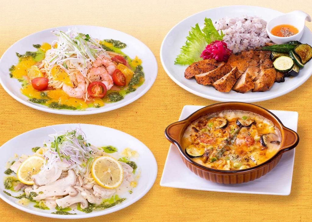 夏季限定食事メニュー。左上から時計回りに「オレンジとトマトの冷製パスタ」(1,200円)、「ポークと夏野菜のロースト雑穀米添え」(1,200円)、「夏野菜のタンドリーグラタン」(1,200円)、「レモンとアワビ茸の冷製パスタ」(1,200円)