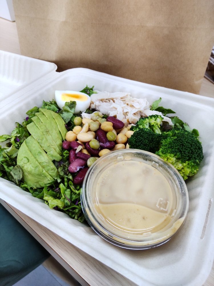 紫キャベツやグリーンカール、サニーレタスのチョップドサラダがもりもり入ったベースに、アボカドやひよこ豆がトッピングされていて食べ応え充分!
