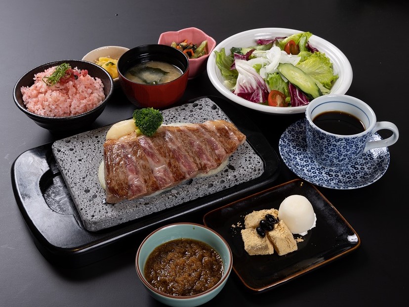 「贅沢和牛御膳(和牛サーロイン120g)」(4,460円)※白ご飯or梅ご飯、味噌汁、小鉢、サラダ、漬物、選べるソフトドリンク、甘味2種盛付
