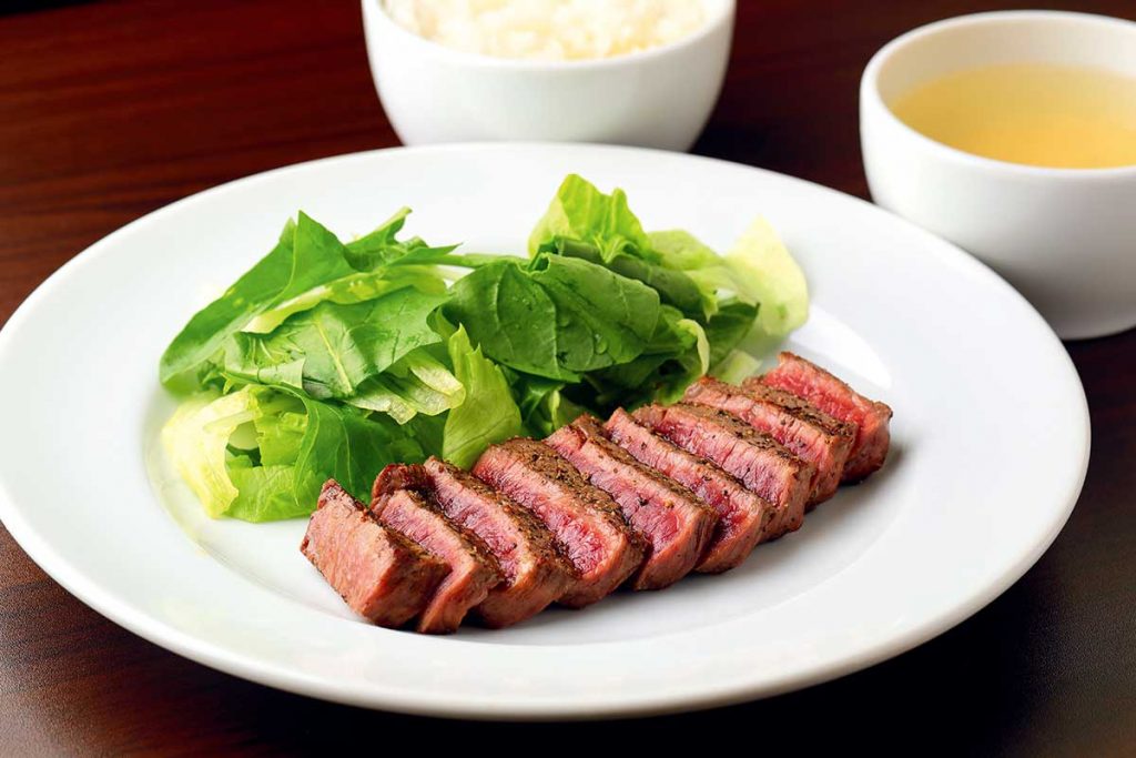 「国産牛ステーキセット」(1,430円※ランチメニュー)※ステーキ、サラダ、ライス、スープ