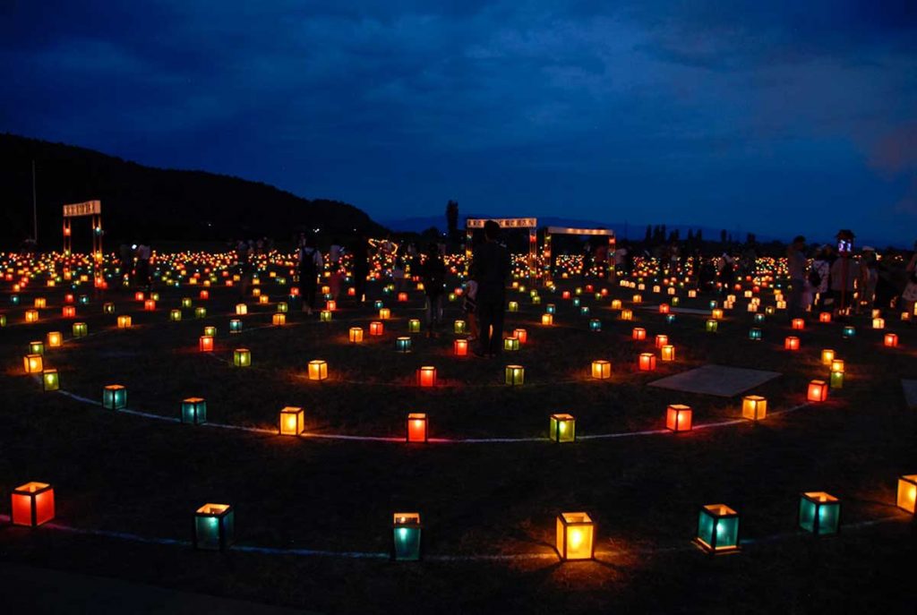 日没後、川原に7千個の灯篭が点灯。淡く輝く色とりどりの灯篭の中を歩けば、特別な思い出になること間違いなし。