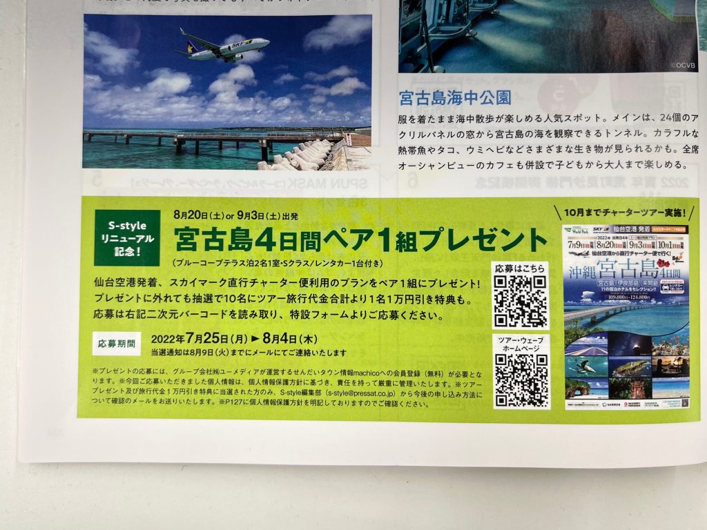 ※S-styleリニューアル記念「仙台直行便で行く宮古島4日間ペア1組プレゼント」応募期間は8月4日(木)までとなります。当選通知は8月9日(火)までにメールにてご連絡いたします
