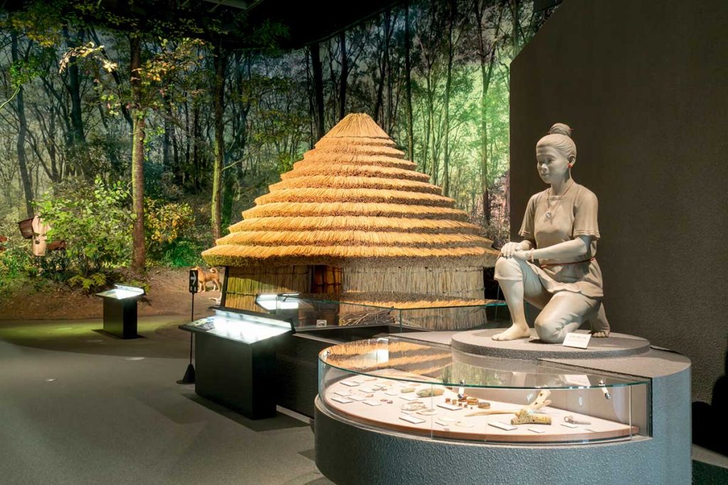 縄文時代の住居内での様子を再現した展示。石器や土器など、生活道具と一緒に見学できますよ