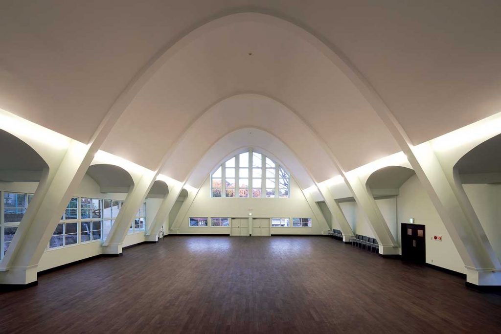美しい曲線が特徴的な大講堂。クラフトマーケット「暮らしの市」の会場にもなり、多くの市民が集う場所です