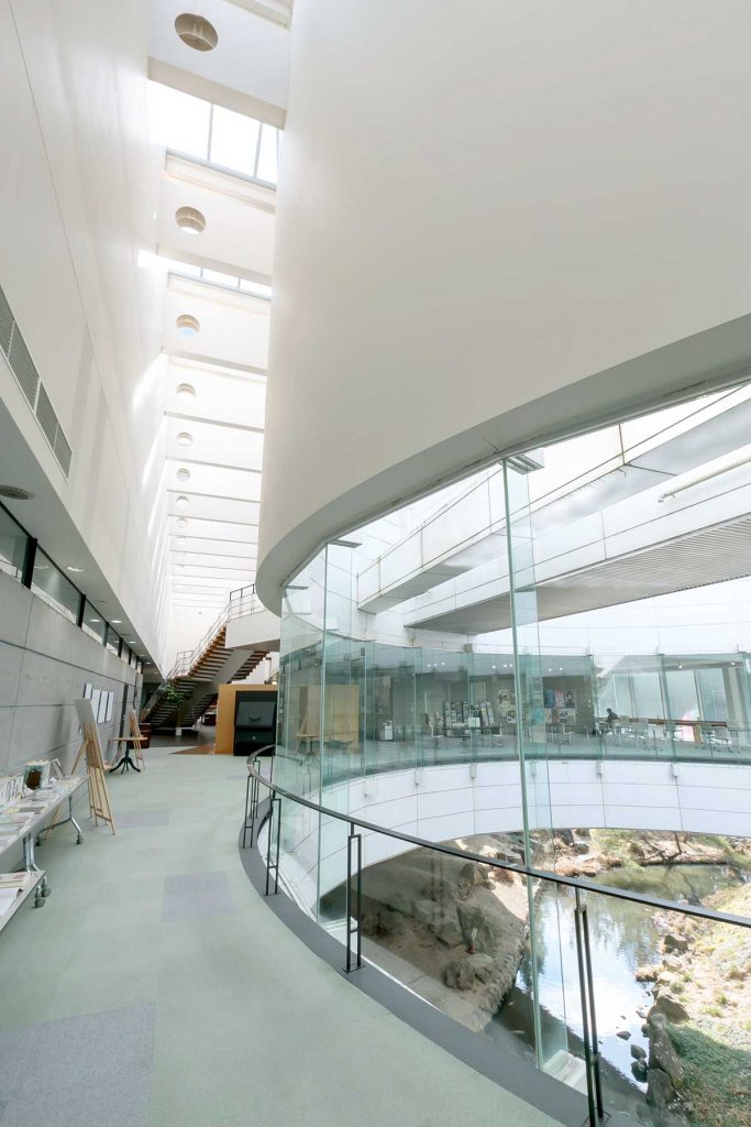 2階に資料を閲覧できる情報コーナーや喫茶室、3階に展示室があり、陽の光が差し込む自然と調和した造りが印象的