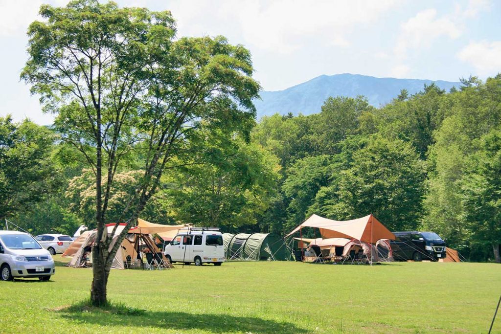 広々とした高原を囲む連邦の姿と、空の抜けが気持ちいいキャンプ場です。予約不要のフリーサイトの最大テント張数は、なんと500張!休日にもなると、色とりどりのテントやタープが高原を埋め尽くします。サイト内の車乗り入れが可能なので、荷物の多いファミリーキャンプにもぴったり。敷地内に温泉施設やビール工場があるのも人気の理由です。開放感抜群のロケーションで、日常を忘れてリフレッシュするにおすすめのキャンプ場ですよ。