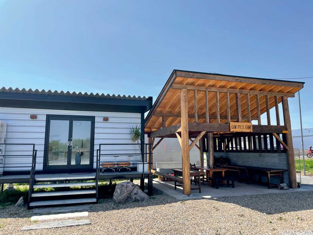 薬莱山の麓に佇む人気ペンション&レストランの『KAMIFUJI』。隣接する広大な敷地を活かして、2022年春にキャンプ場をオープンしました。大自然に囲まれた開放感抜群のサイトは、地面にウッドチップが敷き詰められていてフカフカ!広々とした炊事場とシャワールームを完備しています。キャンプ道具も一式揃っているほか、レストランや温泉も近いので便利ですよ。手ぶらでも気軽にキャンプが楽しめます。