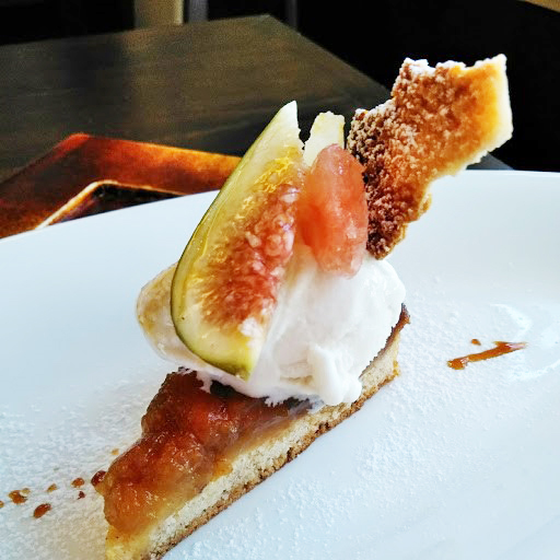 コンポートしたサワールージュとそのジャム、カマンベールが入った熱々のカダイフと冷たいアイスのコラボレーション。