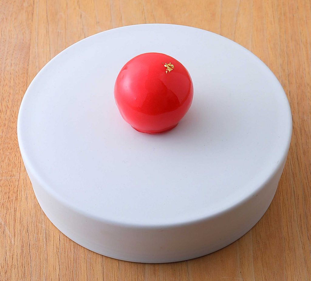 店主がサワールージュの物語をイメージした真紅のスイーツ。サワールージュのコンポートとさつま芋あんをこなしの生地で包み、琥珀寒天をかけて仕立てた一品。