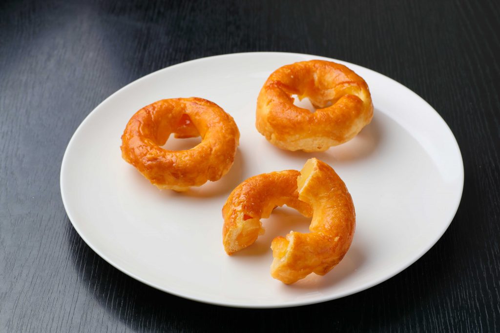 コンポートしたサワールージュをパイで包みサクサクに焼き上げたリングパイ。キャラメルソースがアクセント。