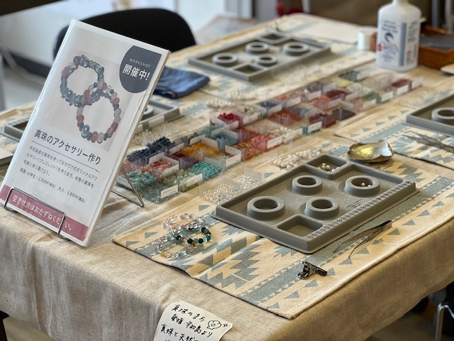 ワークショップブース。小学生2,500円、大人3,500円で本物の真珠付のアクセサリーが作れちゃうだなんて、お得すぎません?