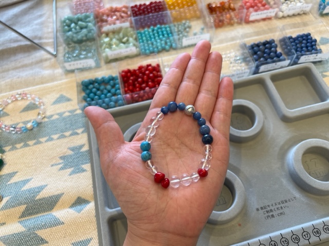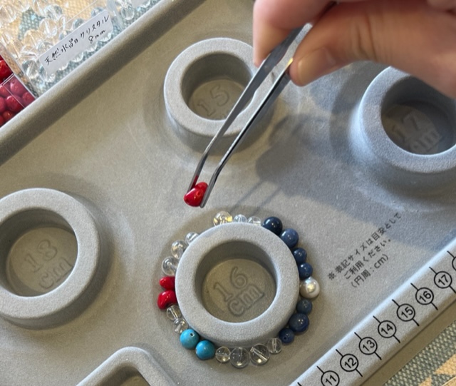 ストーンの配置が決まったら、どんどん糸に通していきます。最後まで詰めたら、糸をギュッと結んで完成。おぉ、思っていた以上に簡単!