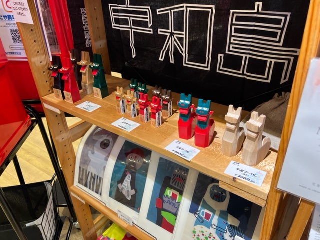 アートな香りがプンプンする民藝コーナーも見逃せません。上段の木彫り人形は、宇和島の伝統文化である「牛鬼」。赤は商売繁盛、緑は健康成就などの意味があるんだとか